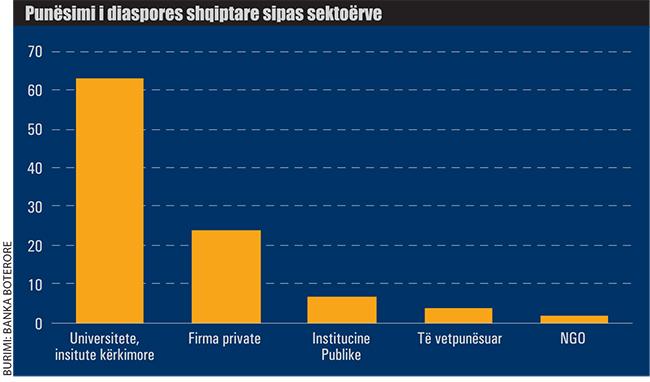 Edhe pse e shpërndarë në pesë kontinente dhe 40 vende të ndryshme, pothuajse 72% e diasporës shkencore shqiptare është e përqendruar në vendet më të industrializuara të OECD-së: SHBA, Itali, Francë, Kanada, Mbretëri e Bashkuar dhe Gjermani.
