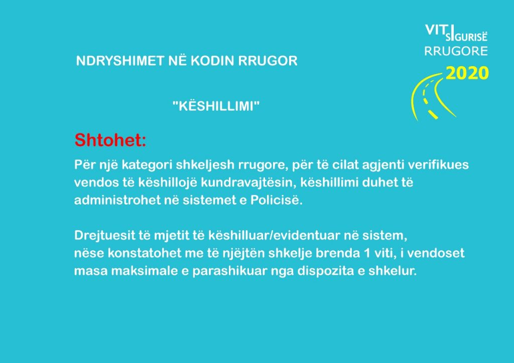 Nëse brenda 1 viti, shoferi konstatohet me të njëjtën shkelje për të cilën thjesht është këshilluar (pa masë administrative), atëherë atij i vendoset masa maksimale e parashikuar për shkeljen.