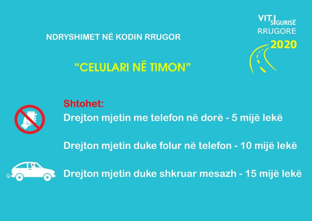 Me ndryshimet në Kodin Rrugor, pritet të ashpërsohen masat për shoferët që përdorin celularin. Nëse je duke i dhënë makinës, dhe thjesht mban celularin në dorë, gjoba propozohet të jet ë5 mijë lekë. Nëse i jep makinës duke folur në telefon, gjoba rritet në 10 mijë lekë.