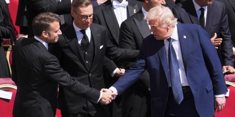 Presidenti i Shteteve të Bashkuara, Donald Trump, dhe homologu i tij francez, Emmanuel Macron, u shtrënguan duart gjatë ceremonisë mortore të Papës Françesku që po zhvillohej në sheshin e Shën Pjetrit.