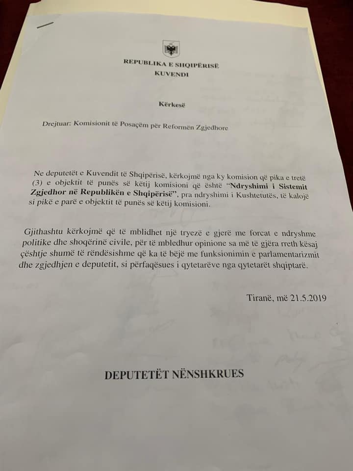 Në këtë drejtim 38 deputetë të opozitës nënshkruan një kërkesë ndaj Kuvendit të Shqipërisë dhe mazhorancës për të mbledhur një tryezë me forcat e ndryshme politike dhe shoqërinë civile për të hapur një diskutim të gjerë publik për reformimin e sistemit zgjedhor.