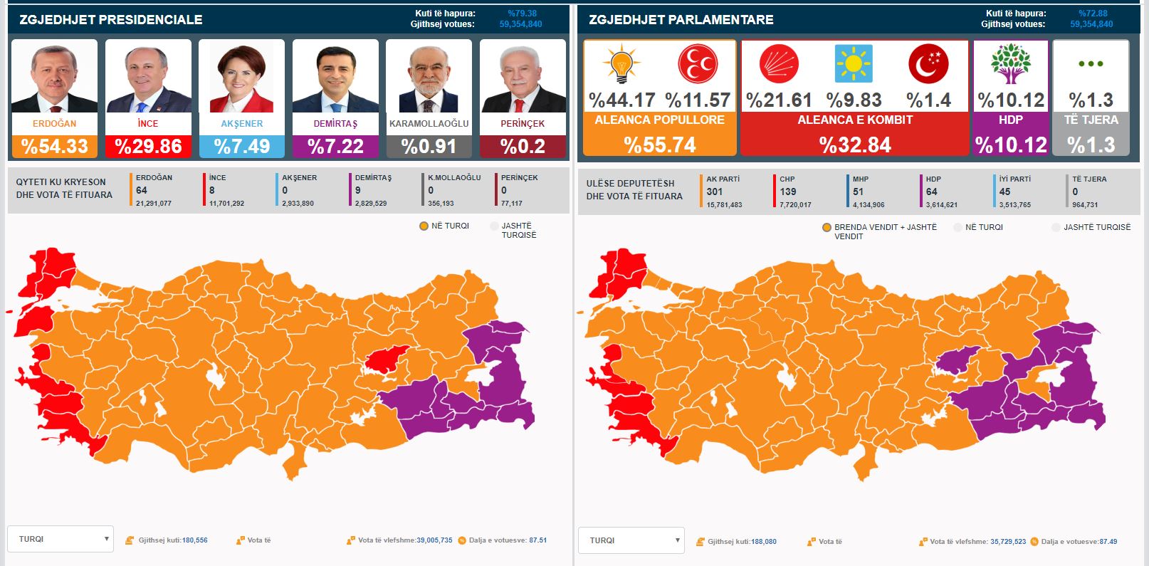 Presidenti aktual, Recep Tayyip Erdogan ka marrë deri në orën 21:00, mbi 53% të votave pas hapjes së 90% të kutive të votimit./b.d