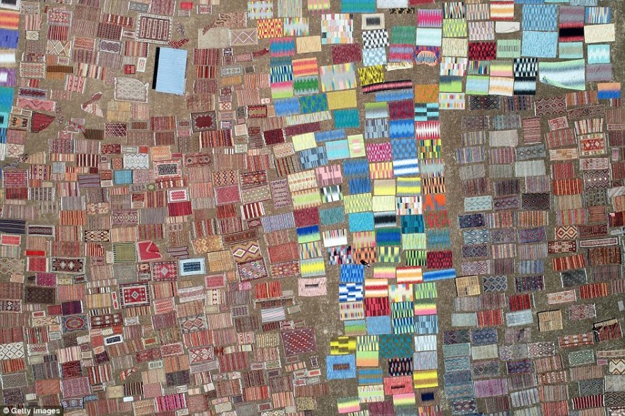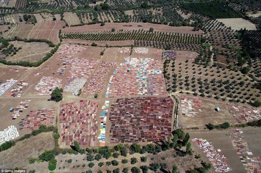 Afër 25 mijë qilima janë vendosur dhe lënë në pikë të diellit në një fushë në Dosemealti të Antalyas për t’ua zbutur ngjyrën dhe për t’ua rritur vlerën në treg. Një dron ka kapur këto fotografi në të cilat shihen qilimat e bëra me dorë dhe janë vendosur në temperaturat e larta për t’i bërë me stil më antik që pëlqehet fort nga turistët perëndimorë.