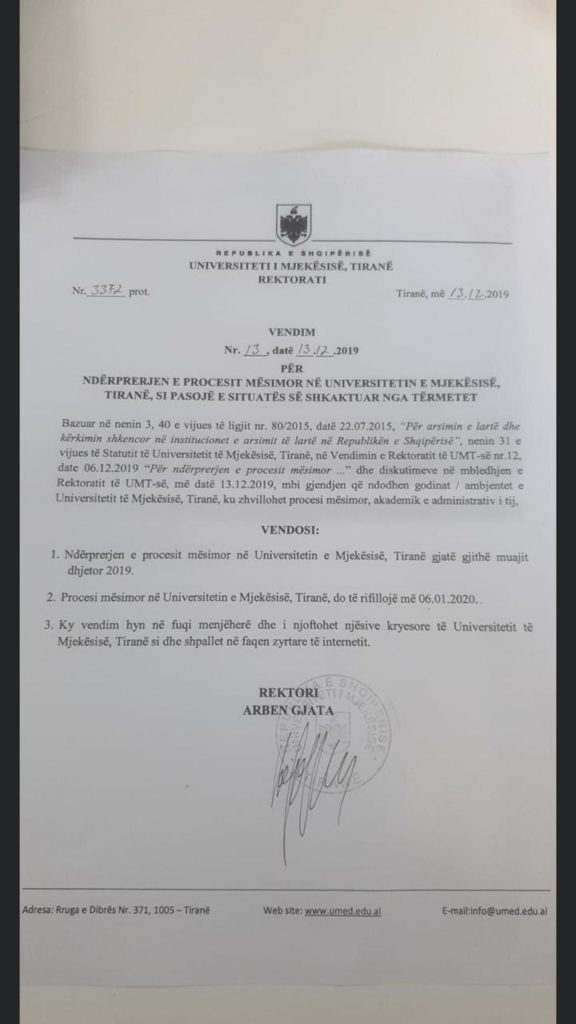 Sipas vendimit të rektorit të Universitetit të Mjekësisë, Arben Gjata stuentët nuk do të zhvillojnë mësim për shkak të dëmtimeve të tërmetit.