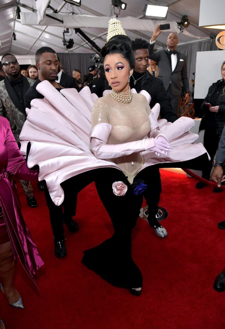 Po fillojmë me Cardi B-në e cila u shfaq me një fustan të çuditshëm, që ngjante me një lule zambak dhe me dorëza të gjata, ndërsa Katy Perry kishte veshur një fustan rozë pa shije.