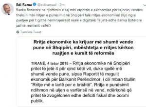 “Banka Botërore në njoftimin e saj mbi raportin e ekonomisë për rajonin, vendos theksin mbi rritjen e punësimit në Shqipëri falë rritjes ekonomike! (Kjo ngre pyetjen për t gjithë helmnxjerrësit realë e digjitalë: Të jetë edhe Banka Botërore jashtë realitetit vallë”, shkruan Rama