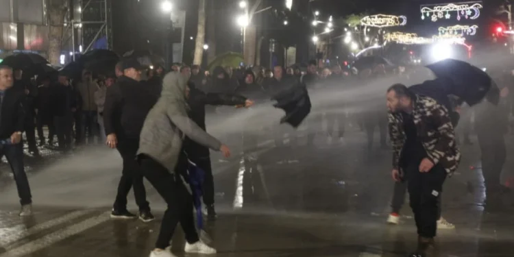 Policia iu përgjigje me autobota me ujë, duke i shpërndarë dhe duke shuar zjarrin që u ndez në disa pjesë të godinës.