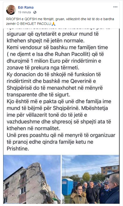 Kemi vendosur së bashku me familjen time (ne djemtë e Isa dhe Ruhan Pacollit) që të dhurojmë #1milion Euro për rindërtimin e zonave të prekura nga tërmeti.