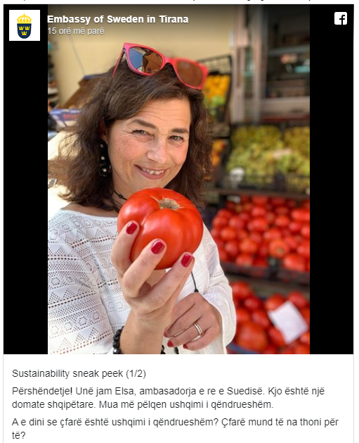 ”Përshëndetje! Unë jam Elsa, ambasadorja e re e Suedisë. Kjo është një domate shqiptare. Mua më pëlqen ushqimi i qëndrueshëm. A e dini se çfarë është ushqimi i qëndrueshëm? Çfarë mund të na thoni për të?”, shprehet ajo, teksa nxjerr edhe foton në faqen e ambasadës.