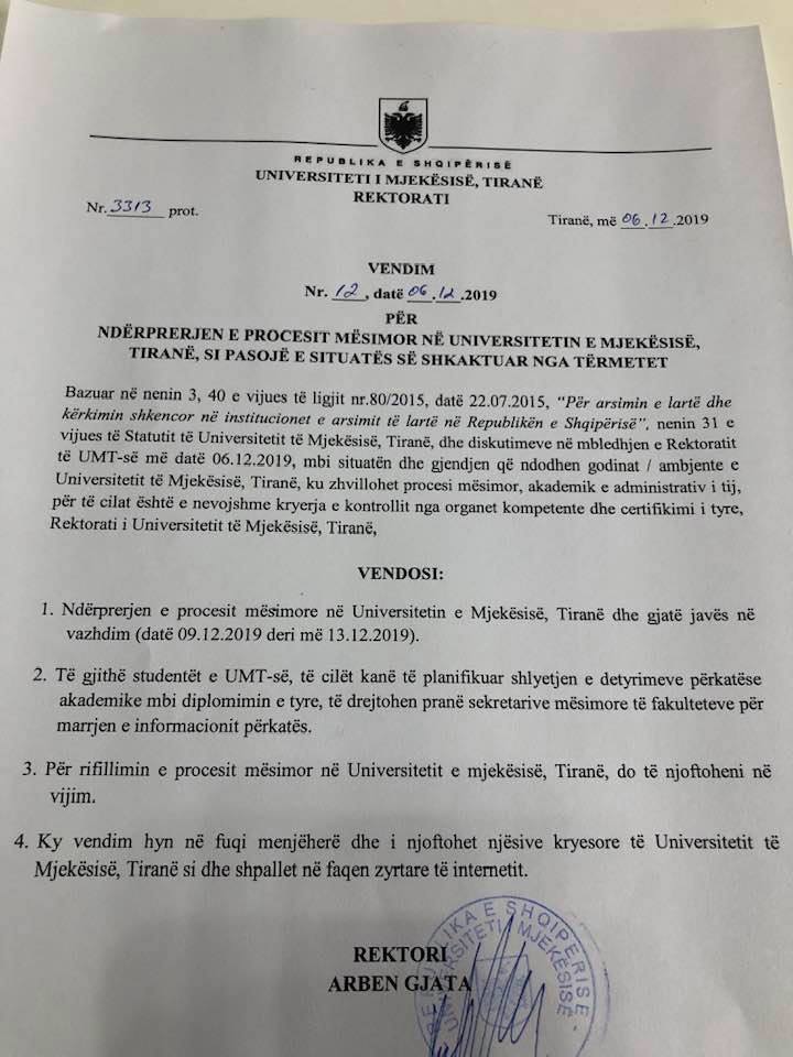 Rektori i Universitetit të Mjekësisë, Arben Gjata njoftoi se vendimi u mor për shkak të situatës dhe gjendjes ku ndodhen godinat e UMT pas tërmetit të 26 nëntorit.