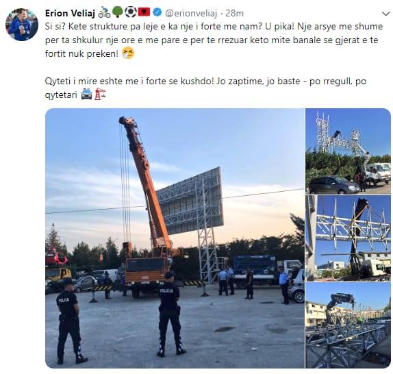 “Si si? Këtë strukturë pa leje e ka një i fortë me nam? U pika! Një arsye më shumë për ta shkulur një orë e më parë e për të rrëzuar këto mite banale se gjerat e të fortit nuk preken! Qyteti i mirë është më i fortë se kushdo! Jo zaptime, jo baste – po rregull, po qytetari”, shkruan Veliaj./a.ç