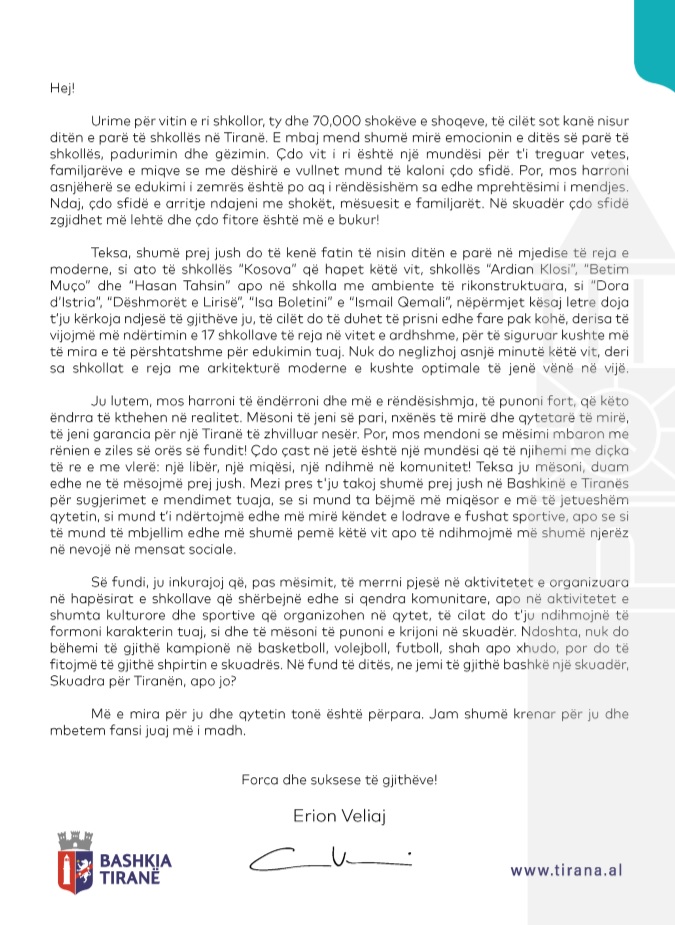 Sot nxënësit e shkollave të Tiranës kanë marrë edhe një letër frymezuese e me keshilla nga kryebashkiaku Erion Veliaj, përmes së cilës ai u uron suksese për vitin e shkollor. Në fjalet e shkruara plot emocion per nxënësit, Veliaj thote se çdo vit i ri është një mundësi për t’i treguar vetes, familjarëve e miqve se me dëshirë e vullnet mund të kalojë çdo sfidë.