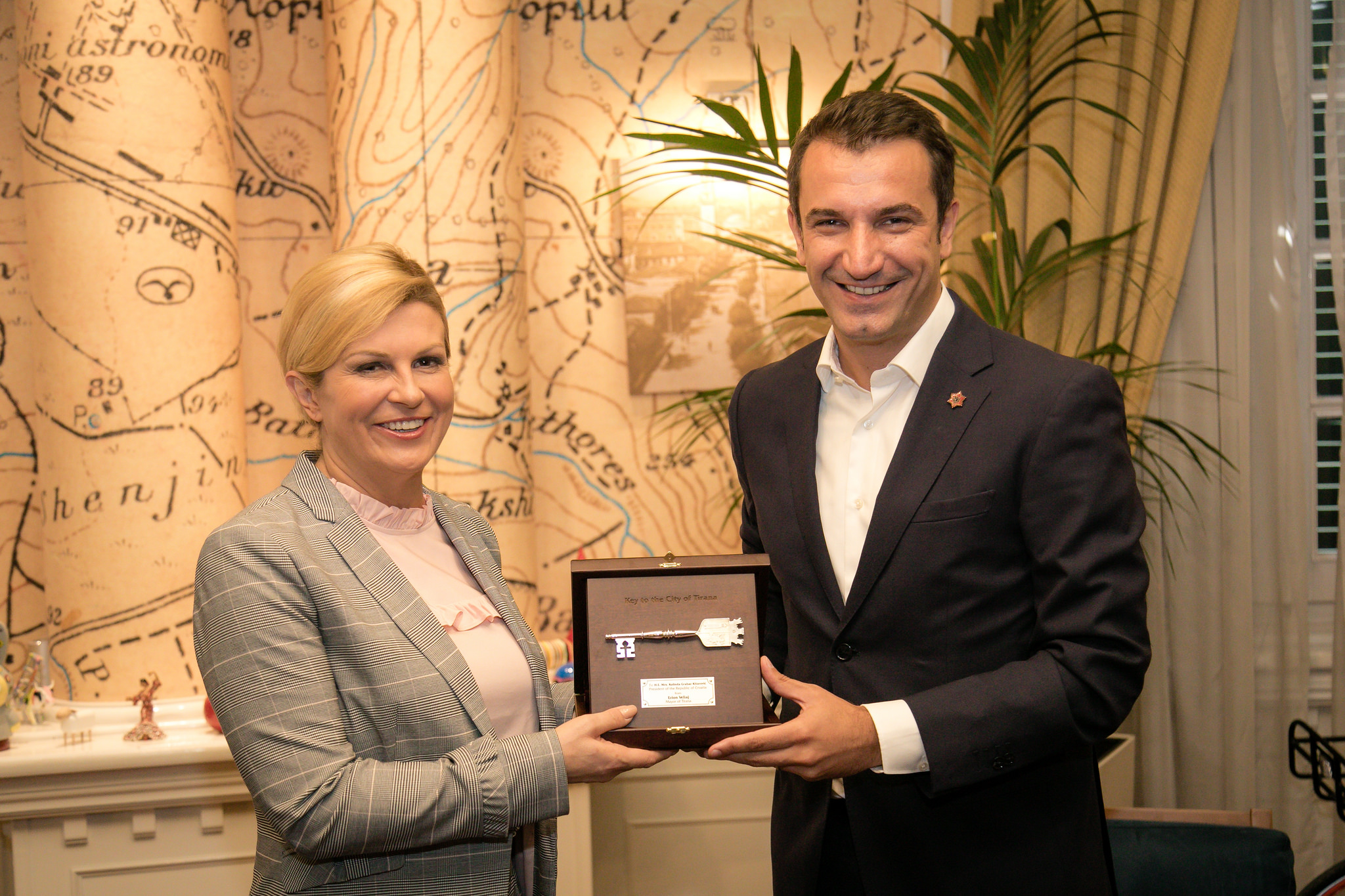 Në shenjë miqësie, Veliaj i dorëzoi Presidentes së Kroacisë, Kolinda Grabar-Kitarović edhe “Çelësin e Qytetit”. “Po e vendos këtë çelës në xhepin tuaj, në emër të Këshillit Bashkiak dhe ekipit tonë, si një mënyrë për të shprehur vlerësimin tonë maksimal për advokacinë tuaj të mrekullueshme, jo vetëm për Kroacinë, por për të gjithë rajonin. Ne ju shohim si një prej nesh, e si e tillë po ua japim këtë çelës, ndaj nuk ka rëndësi se ku do t’ju shpjerë jeta, si Presidente, si qytetare, turiste, ose thjesht një mike që kthehet sërish, ju gjithmonë do keni çelësin e një vendi që ju mirëpret”, deklaroi Veliaj.