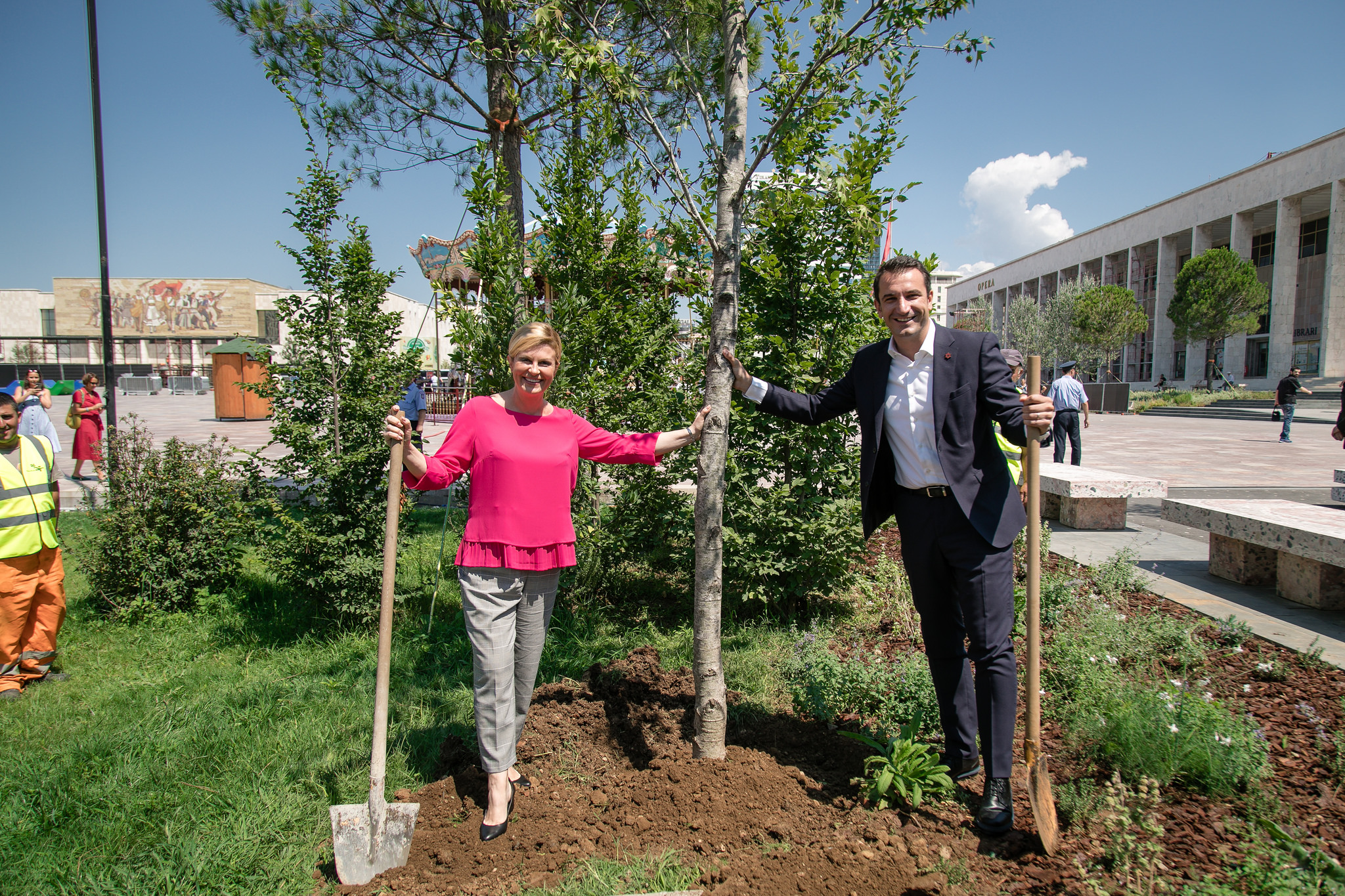Më pas, Presidentja kroate dhe kryebashkiaku i Tiranës vizituan edhe “Parkun Europa” në sheshin “Skënderbej”, ku në mënyrë simbolike të miqësisë, mbollën edhe një pemë.