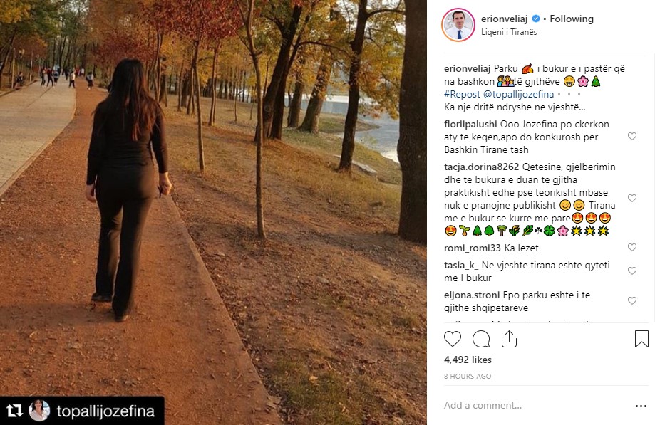 Ndërkohë foton e Topallit e ka bërë repost edhe kryebashkiaku i Tiranës, Erion Veliaj. Në postimin e tij Veliaj shkruan: “Parku i bukur e i pastër që na bashkon të gjithëve.”