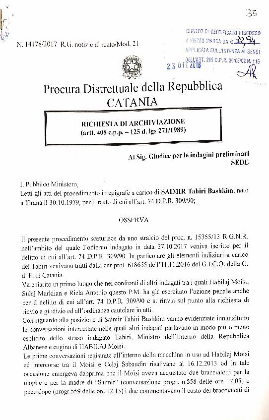 Në dokumetet e publikuara pak ditë më parë rezulton se Gjykata e Katanias e ka mbyllur hetimin për Saimir Tahirin, pasi prokuroria e Antimafias nuk gjeti prova dhe fakte që implikojnë ish – ministrin Tahiri në trafikun e drogës apo ndihmën e grupit të “Habilajve”.