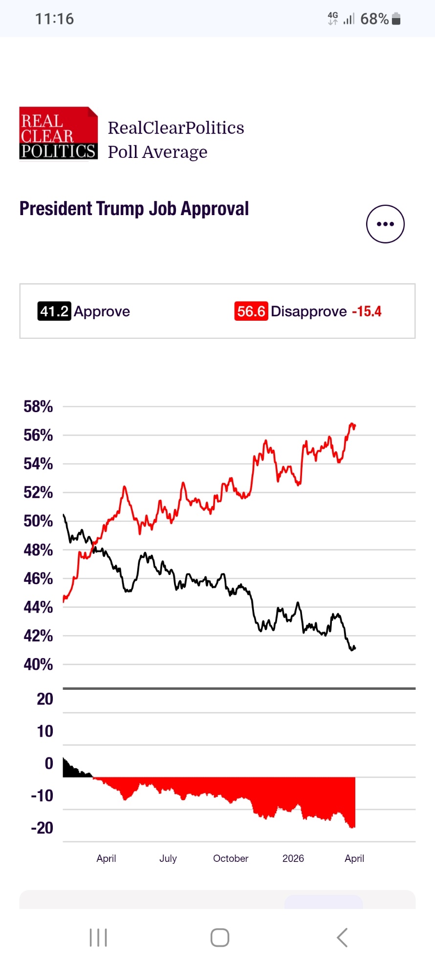 Dhe mungesa e një fitore të shpejtë në Iran po reflektohet në sondazhet e opinionit amerikan. Sot mesatarja e kuotave të Presidentit Trump është kthyer poshtë nivelit të dhjetorit – 56.6% e amerikanëve kanë vlerësim negativ, dhe vetëm 41.2% pozitiv….