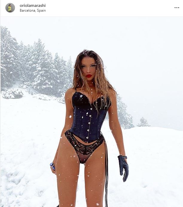 Në foton e postuar nga vetë ajo, Oriola ka dalë në dëborë duke treguar edhe setin e veshjes intime ngjyrë të zeza, të dizenjuara nga mikesha e saj e ngushtë, Aurela Hoxha.