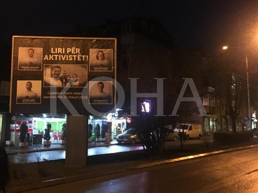 Mbrëmjen e së dielës, qe ka qene ditë uikendi e feste per pavaresine, në disa billborda nëpër kryeqytet janë vendosur posterë me katër aktivistët e Vetëvendosjes të cilët janë dënuar në shkallën e parë si të dyshuar për sulm me granatë ndaj Kuvendit të Kosovës. Billbordat kërkojnë drejtësi për pesë aktivistët, të cilët më 22 shkurt do të dalin para panelit të Gjykatës së Apelit.