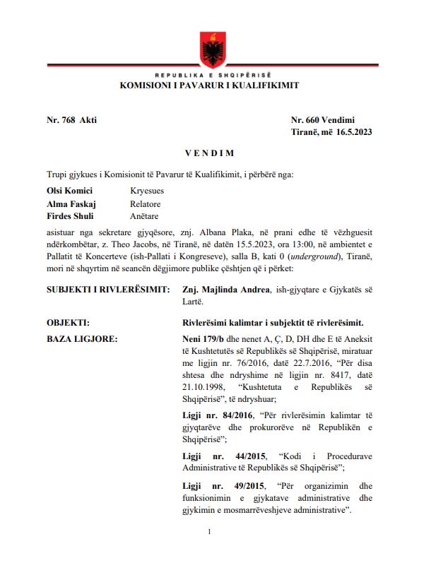 Komisioni i Vetingut ka marrë një vendim të pazakontë në 16 maj 2023. Trupa gjykuese e përberë nga Olsi Komici, Alma Faskaj dhe Firdes Shuli shkarkoi nga detyra ish anëtaren e Gjykatës së Lartë, Majlinda Andrea, e cila është dënuar në qershor të vitit 2017 me 4 vite burg nga Gjykata e Lartë për korrupsion, konvertuar në 3 vite shërbime prove. Majlinda Andrea u shpall fajtore për marrjen e një ryshfeti 50 euro, për të mos pranuar rekursin për një vendim pronësie në zonën e Butrintit. Vendimi i Gjykatës së Lartë ishte përfundimtar, pasi gjykatë e juridiksionit fillestar për zyrtarë të nivelit të lartë.