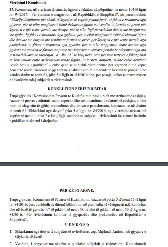 “Trupi gjykues, duke vlerësuar se subjekti i rivlerësimit rezulton i dënuar me vendim të formës së prerë për veprën penale “korrupsion pasiv i gjyqtarëve, prokurorëve dhe funksionarëve të tjerë të organeve të drejtësisë”, në mungesë të një vendimi të organeve kompetente të kohës, ish Këshilli i Lartë i Drejtësisë dhe atyre sot, Këshilli i Lartë Gjyqësor, çmon se duhet të kryejë procesin e rivlerësimit. Trupi gjykues i kaloi subjektit barrën e provës se në analizë të vendimit të Kolegjit Penal të Gjykatës së Lartë, i cili e ka dënuar atë për veprën penale “korrupsion pasiv i gjyqtarëve, prokurorëve dhe funksionarëve të tjerë të organeve të drejtësisë”, subjekti ka cenuar rëndë besimin e publikut te sistemi i drejtësisë”, thuhet në vendimin e KPK-së.