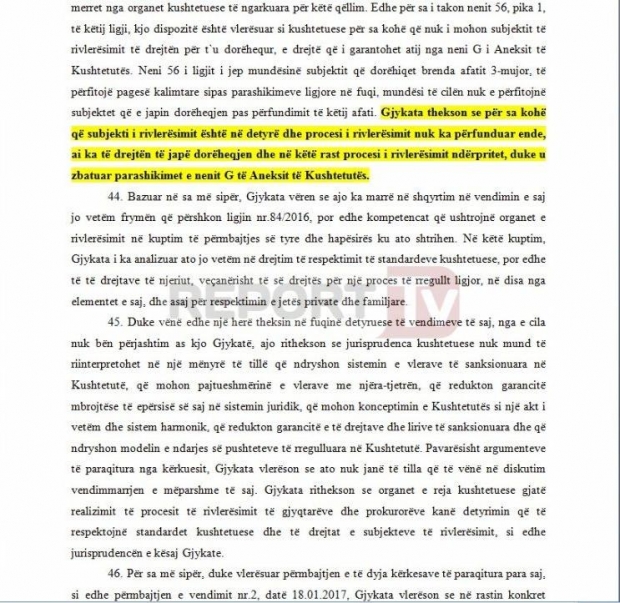 (Me të verdhë pjesa vendimit që shpëton gjyqtarët nga Vettingu në rast dorëheqje)