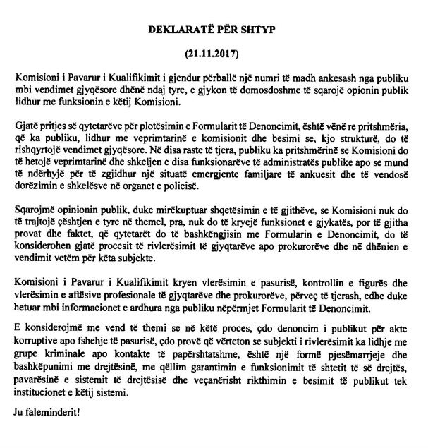 “Por të gjitha provat dhe faktet, që qytetarët do të bashkëngjisin me Formularin e Denoncimit, merren ne konsiderate gjatë procesit të rivlerësimit të gjyqtarëve apo prokurorëve dhe në dhënien e vendimit vetëm për këta subjekte” – njofton KPK. /JavaNews/b.d