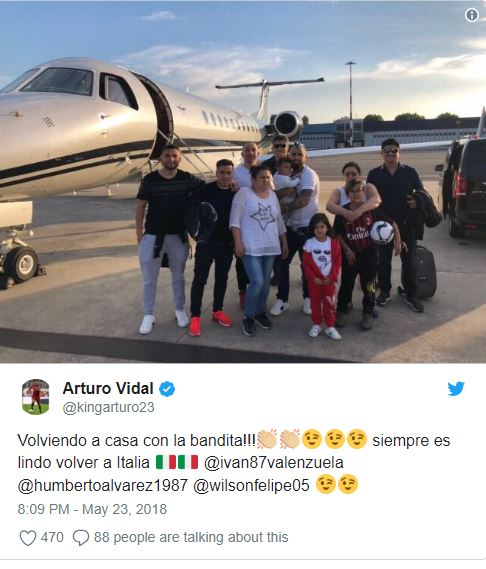 Vidal postoi një fotografi në rrjetet sociale ku shihej sesi kish zbritur në Itali bashkë me familjen dhe shokët e tij.“Në shtëpi me bandën! Gjithmonë është mirë të kthehesh në Itali”.