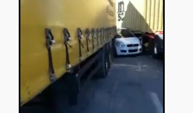 Persona nga vendngjarja raportojnë se manovrimi i gabuar në krah të kundërt ka bërë që mjeti i vogël të mbetet i ngecur mes 2 kamionëve të mëdhenj, shoferët e të cilëve kanë bërë përpjekje për ta shmangur rrezikun e jetës së pasagjerëve në mjetin e vogël me ngjyrë të bardhë.