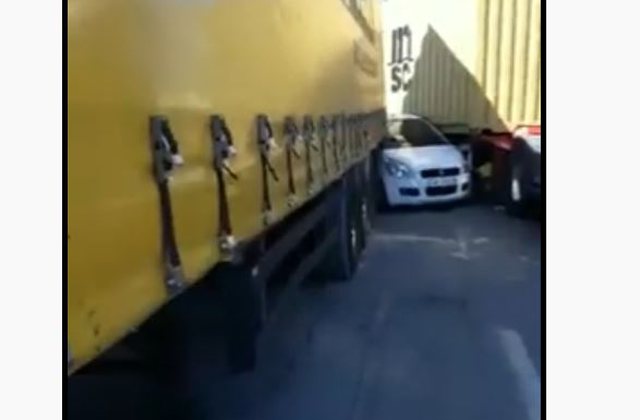 Persona nga vendngjarja raportojnë se manovrimi i gabuar në krah të kundërt ka bërë që mjeti i vogël të mbetet i ngecur mes 2 kamionëve të mëdhenj, shoferët e të cilëve kanë bërë përpjekje për ta shmangur rrezikun e jetës së pasagjerëve në mjetin e vogël me ngjyrë të bardhë.