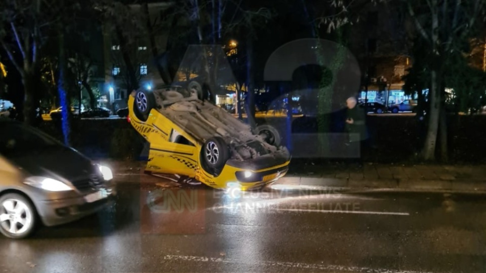Një taksi është përmbysur në mes të rrugës. Ende nuk dihen shkaqet e aksidentit.