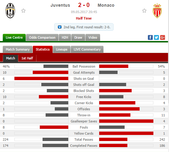 Eshte mbyllur pjesa e pare e ndeshjes Juvenjtus- Monaco me rezultatin 2-0. Golat per italianet u shenuian nga Mandzukic dhe Dani Alves.