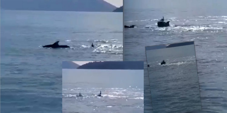Përmes një video të siguruar nga abcnews.al shikohet momenti kur familja e delfinëve dhuron “spektakël”, për të gjithë kalimtarët aty.