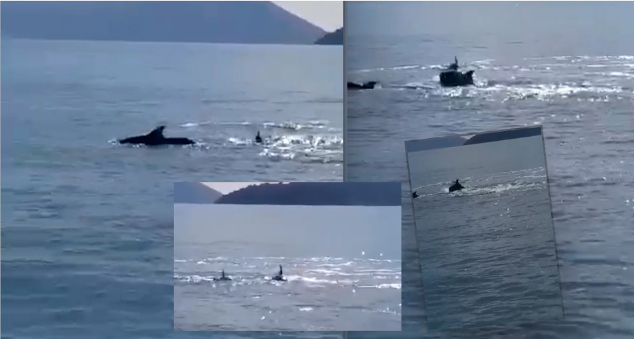 Përmes një video të siguruar nga abcnews.al shikohet momenti kur familja e delfinëve dhuron “spektakël”, për të gjithë kalimtarët aty.