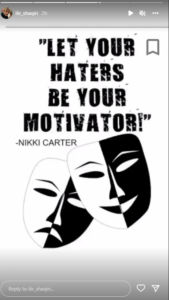 Duke mos iu drejtuar drejtpërdrejt, balerini ka zgjedhur ta thumbojë përmes një statusi në Instastory ku shkruhet: “Lëri ziliqarët e tu të jetë motivuesit e tu.” Postimi i shpërndarë nga ai shoqërohet edhe me dy maska, si për të nënkuptuar se Tani është njeri me shumë fytyra.