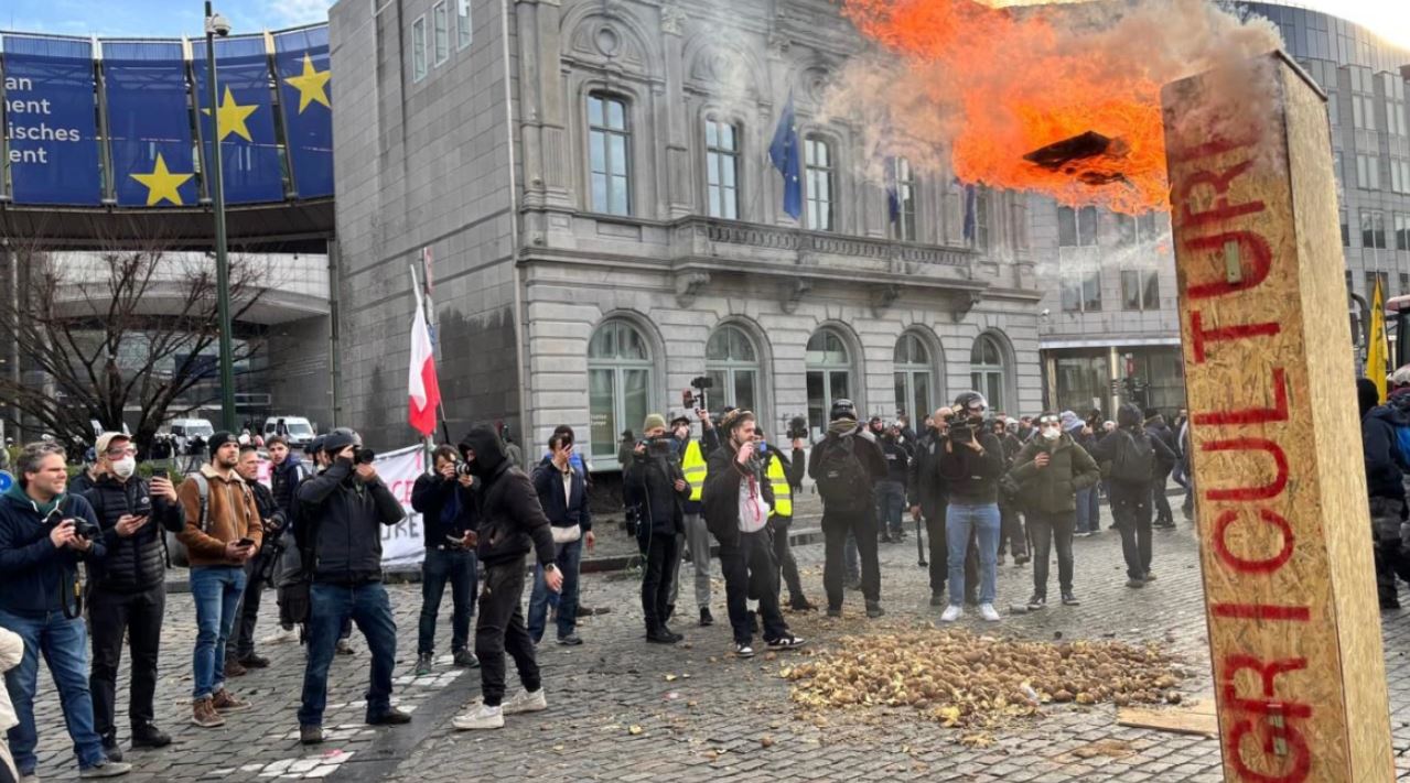 Incidente të rënda po ndodhin në Bruksel, jashtë ndërtesës së Parlamentit Europian, me fermerë që vënë zjarre, ndezin bomba tymi dhe hedhin objekte drejt policisë.