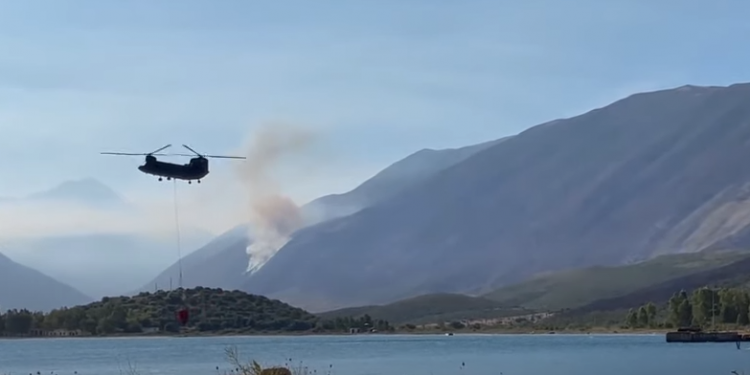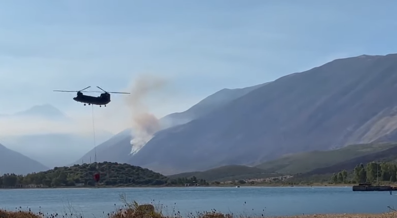 Ndërkohë që në Dukat dhe Gjirin e Gramës janë riaktivizuar dy vatra zjarri, mëngjesin e sotëm ka ndërhyrë edhe helikopteri ‘Chinook’ nga Holanda me kapacitet ujëmbajtës 10 mije litra ose me kapacitet sa 5-fishi i helikopterit tonë.