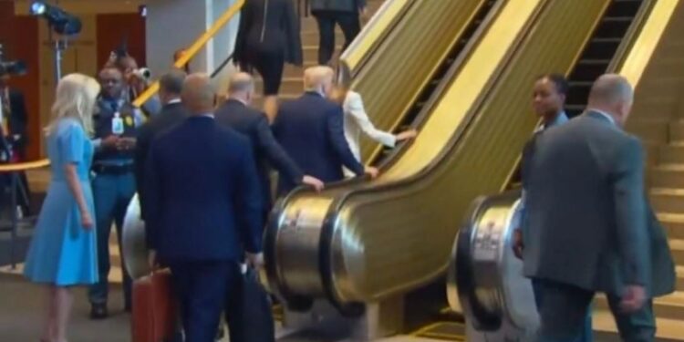 Presidenti amerikan dhe bashkëshortja e tij, Melania, u gjendën në një moment të sikletshëm me mbërritjen e tyre, pasi pikërisht kur po përgatiteshin të ngjiteshin, shkallët lëvizëse u ndalën papritur, duke e detyruar çiftin Trump të vazhdonin të ngjiteshin shkallëve në këmbë.