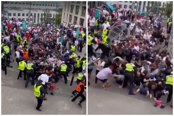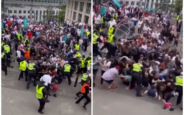 Nga pamjet e publikuara nga shkallët e stadiumit Uembli, shikohet se si qindra fansa thyejnë rrethimin e policisë dhe tentojnë të hyjnë në stadium pa biletë.