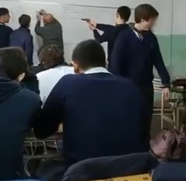 Një nxënës i shkollës së mesme katolike në Argjentinë u filmua duke i drejtuar një armë në kokë mësuesit, ndërsa kishte kthyer shpinën dhe po shpjegonte mësiminr.
