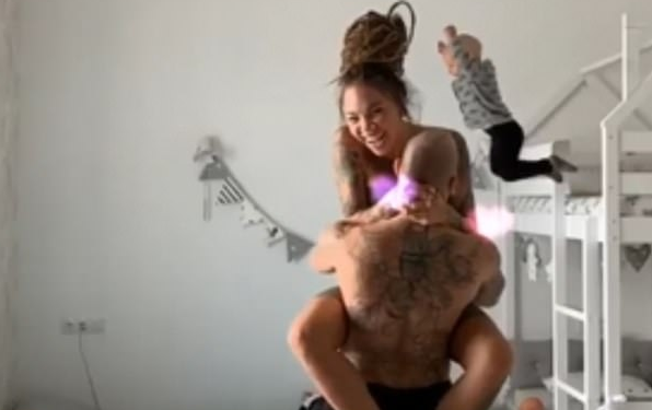 Sveta hidhte në ajër në një përqafim akrobatik, por në cepin e videos Gabrieli i vogël mund të shihet duke u ulur duke u përgatitur të hidhet nga krevati i tij.