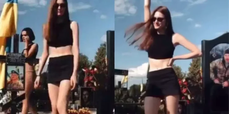 Video e bërë virale tregon dy motrat, e veshura me bluza të zeza dhe pantallona të shkurtra duke kërcyer ndërsa qëndrojnë midis varreve të ushtarëve që janë stolisur me lule dhe flamurin ukrainas.