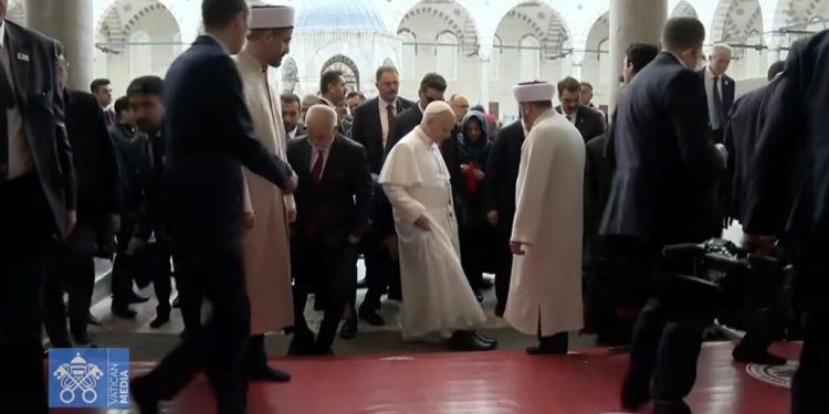 Papa Leoni XIV, i cili po zhvillon një vizitë zyrtare në Turqi, shkoi edhe në Xhaminë Blu të Stambollit, ku u prit dhe u shoqërua nga kreu i Diyanet-it, presidenti i Çështjeve Fetare, Safi Arpagus. Ashtu si paraardhësi i tij, Papa Françesku, dhe të tjerë para tij, edhe Leoni XIV hoqi këpucët në respekt të traditave vendase.