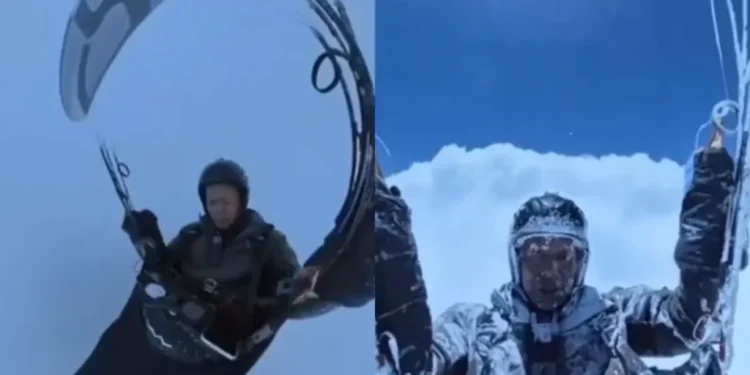Në video shihet se si Peng mban fort kontrollin e parashutës, me fytyrën dhe trupin të mbuluar nga kristale akulli.