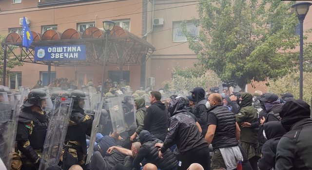 Trupat e misionit paqeruajtës të NATO-s në Kosovë, KFOR, janë përleshur në pasditen e së hënës më disa protestues serbë, të tubuar para ndërtesës së Komunës së Zveçanit.