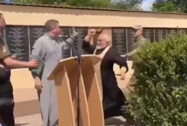 Mykhailo Vasiliuk i Patriarkanës së Moskës u filmua duke ndërprerë funeralin e ushtarit të rënë Oleksandr Zenivy. Në video shihet prifti që përpiqet t’i shkëpusë kryqin priftit, Anatoly Dudko, përpara se ta sulmojë. Pasi Vasiliuk u tërhoq zvarrë, personeli ushtarak se u detyrua të ndërhynte në sherr.