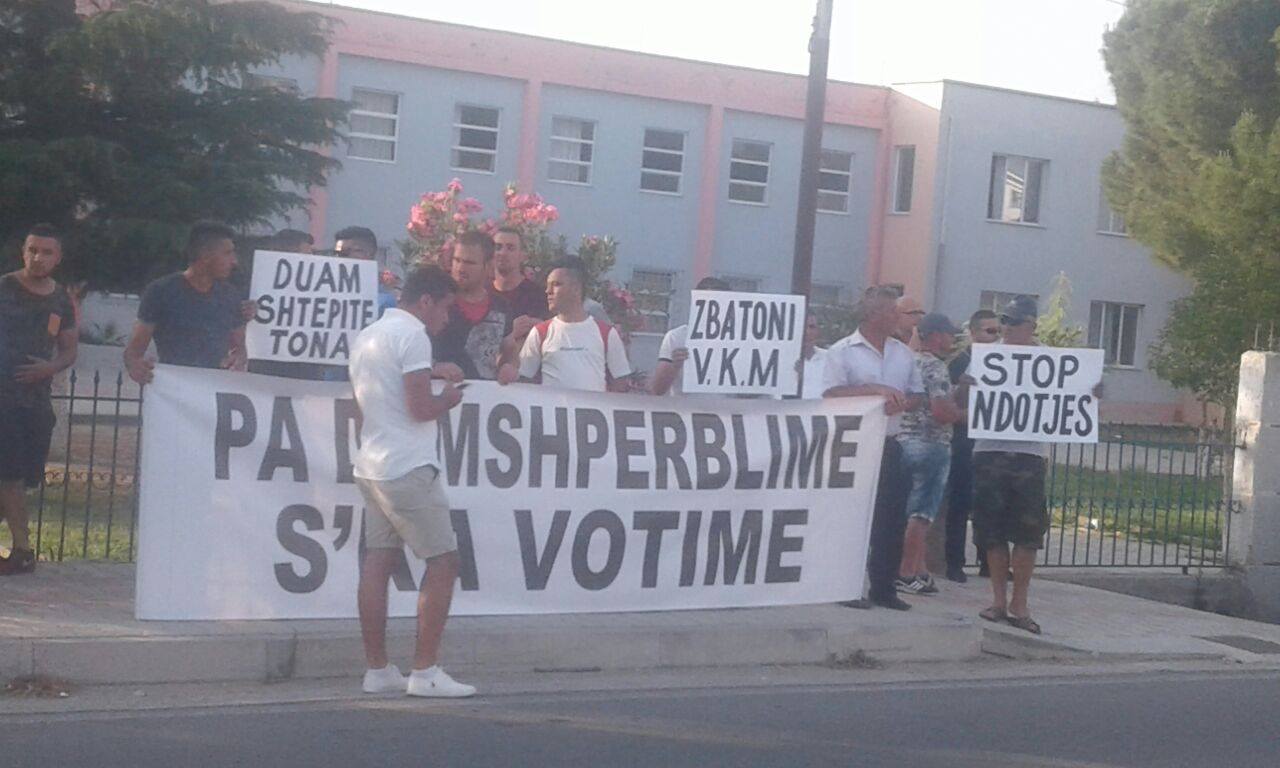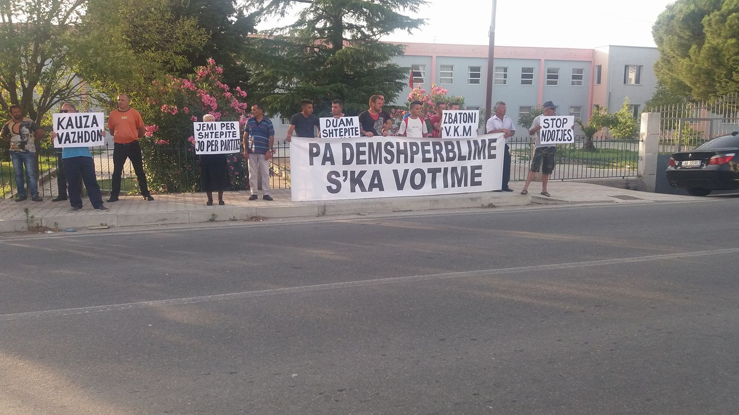 Disa banorë të Zharrëzës i kanë dalë para me parulla si “Pa dëmshpërblime s’ka votime”; “Duam shtëpitë tona”; “Zbatoni V.K.M”; “Stop Ndotjes”.