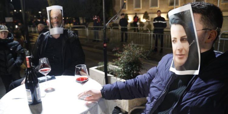 Gjatë protestës që Partia Demokratike po zhvillon mbrëmjen e sotme para kryeministrisë, 2 pjesëmarrës inskenuan një takim mes kryeministrit Edi Rama dhe zëvendëskryeministres Belinda Balluku, të formësuar sipas akuzave që opozita ka për dyshen qeverisëse.