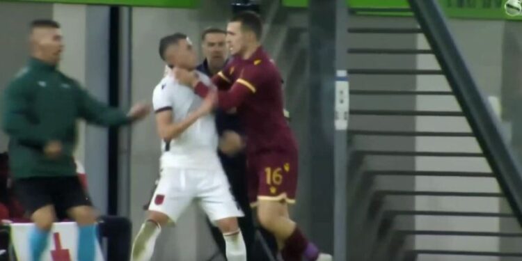Në minutën e 51’, Petkov i vë duart në fyt Asanit pas një faulli. Gjyqtari në fund u tregon të dy lojtarëve kartonin e verdhë./m.j