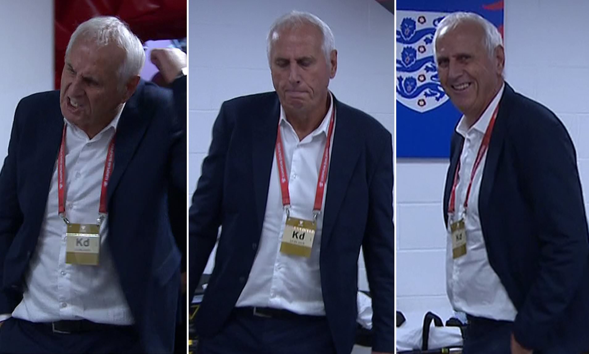 Trajneri i Kosovës ka nisur të ofendoj me zë të lartë por kur ka kuptuar se po filmohet nisi të buzëqesh, një video e cila ka sjellë ilaritet edhe në mediat britanike.